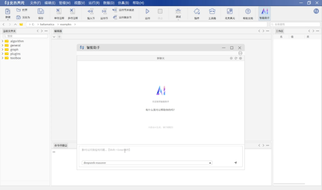 智能助手功能实现了多源大语言模型的融合与高效调用,内置北太天元专有科学计算知识库,可精准识别用户的科研与工程需求,自动生成符合规范的数学模型与高质量代码。该功能有效降低了科学计算与建模的技术门槛,为科研人员与工程师提供了高效的开发辅助,显著提升开发效率。