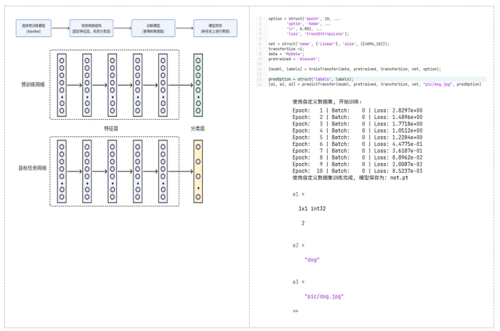 深度学习工具箱:新增迁移学习功能,在网络搭建、模型训练至结果预测的全流程支持基础上,实现对预训练模型的高效复用,大幅缩短模型开发周期,加速深度学习技术在实际场景中的落地应用。