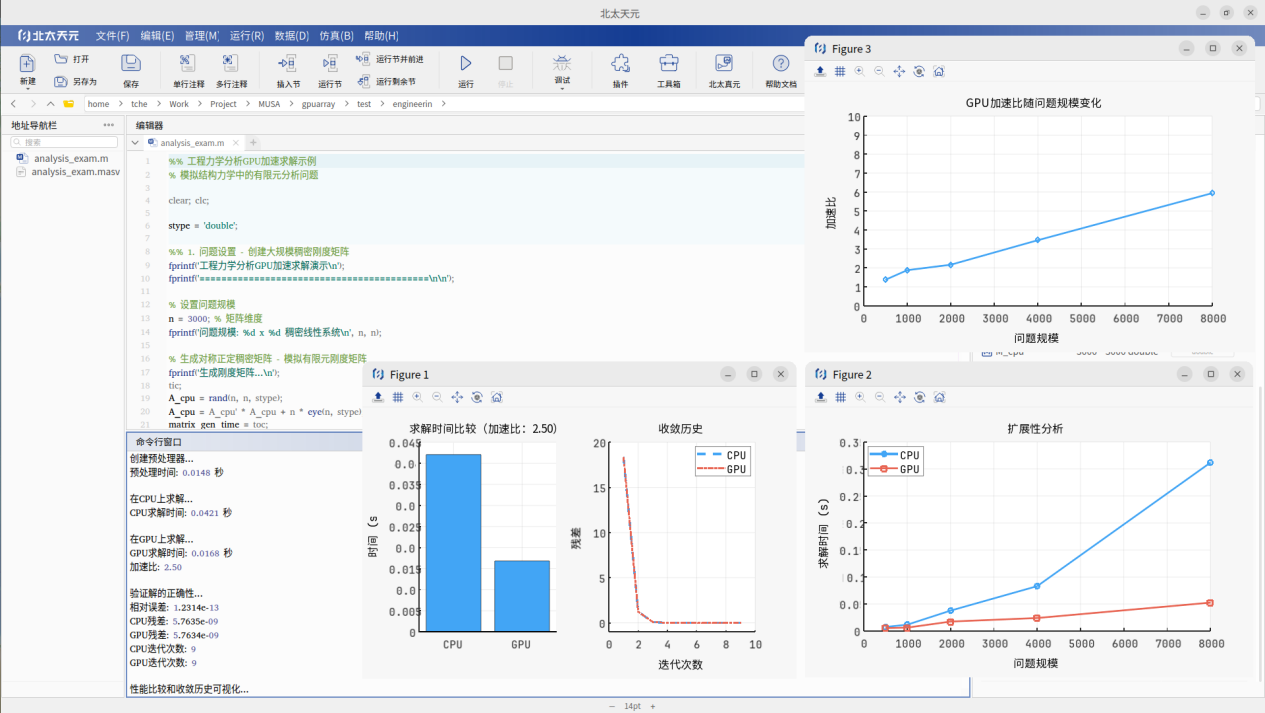 并行计算工具箱:针对大规模科学计算的算力需求,全新推出以GPU并行计算为技术底座的并行计算工具箱。通过定义gpuArray数据结构并重载核心内置运算函数,将GPU的并行计算能力深度融入北太天元科学计算生态,大幅提升复杂科学计算任务的处理效率,为海量数据并行运算提供稳定高效的算力支撑。
