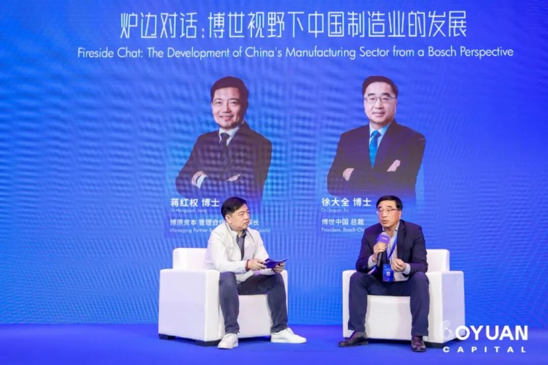 作为大会的重要环节,博世中国总裁徐大全在与蒋红权的对话中,从全球领军企业视角分享了对中国制造的观察。他指出,在全球增长承压的背景下,中国市场尤其在电动化、智能化领域所展现的创新活力与“中国速度”,正推动其从“本地化生产”基地向“服务全球”的研发策源地转变。徐大全特别指出,面对供应链重构,博世积极寻求与中国本土企业合作以增强体系韧性。他高度认可博原资本作为“关键连接器”的作用:“博原能精准洞察博世的战略需求与创新生态,高效链接双方。未来我们有望在AI、机器人等领域携手投资,共同推动产业升级。”