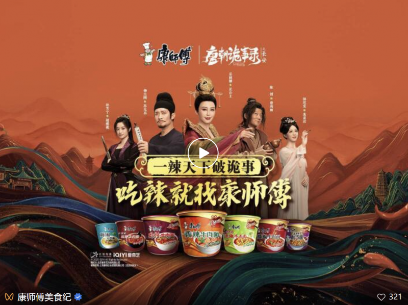 最近,康师傅辣口味与头部长剧《唐朝诡事录》联动,提供了一套值得深入剖析的完整打法。它不止于单点创意,而是通过“文化共鸣-场景打穿-产品闭环”的系统性构建,尝试将“辣”从产品卖点转化为一种可流通的“社交货币”。