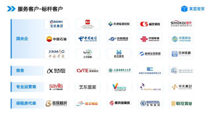 产品已成功应用于中国宝武友间公寓、北京首钢、上海金茂集团、湖北省保障房、北京国数、第一太平戴维斯集团等众多知名项目,帮助公寓企业管理的房源超百万间规模,用实际案例证明数字化解决方案降本增效、提升服务品质。