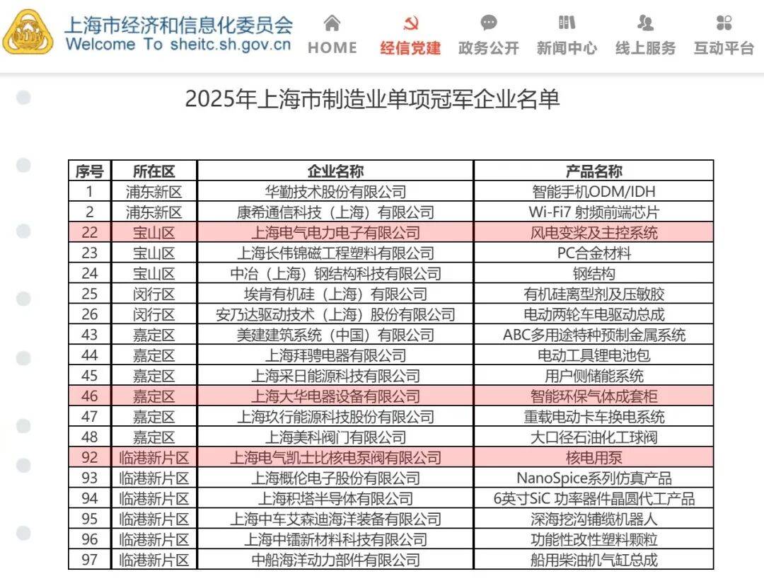 上海市经信委日前公布2025年“上海市制造业单项冠军企业”名单,上海电气旗下上海电气凯士比核电泵阀有限公司、上海电气电力电子有限公司、上海大华电器设备有限公司三家企业成功上榜。