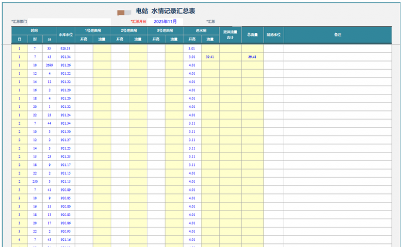 水情变化直接关系到水电站的发电调度与防洪安全。勤哲Excel服务器支持建立进水闸、泄洪闸及无闸泄洪等多种水情数据关系表,对不同工况下的数据进行统一管理。水情数据按规定频次登记后,系统可自动计算流量,并生成水情数据汇总表,为发电调度、防汛决策和运行分析提供准确依据。水情管理由人工计算转向系统化处理,使调度决策建立在可靠数据基础之上,提升运行的安全性和稳定性。