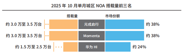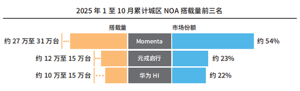 此外,在2025年1月至10月期间,元戎启行累计交付搭载城区NOA的量产车型约12万至15万台,累计市占率约为23%,成功跻身行业前三。