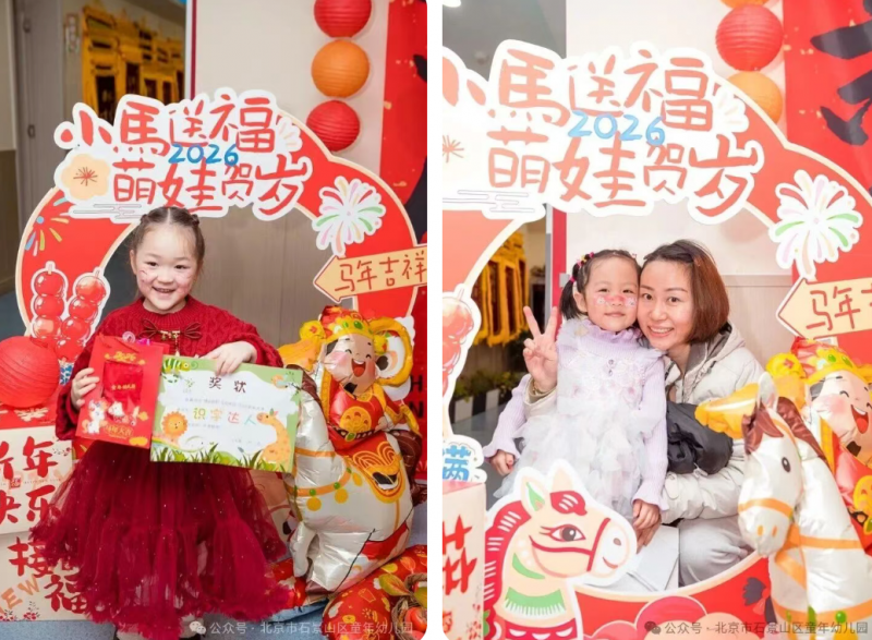 活动的最后,家长和孩子们在一楼大厅的新年景观打卡点留下美好瞬间。红红火火的背景,憨态可掬的小马装饰,还有一张张灿烂的笑脸,共同构成了这个冬日最温暖的画面。