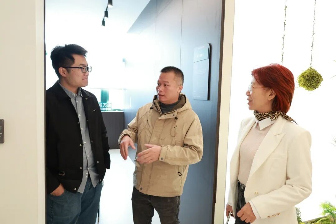 ▲耀东华集团副总经理吴惠娟女士(右)、质量技术服务部经理胡硕飞先生(中)与华南农业大学带队老师(左)讨论饰面板应用趋势