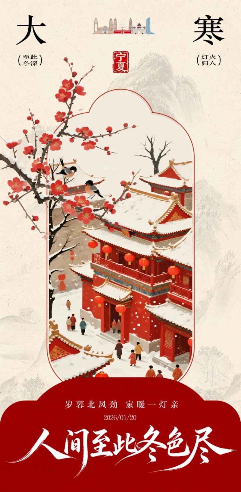 二十四节气的最后一笔,落向山河静默处。风从北疆来,在贺兰山崖刻下凛冽的篆章,雪落黄河岸,为岁暮盖上澄澈的银妆。这里是冬的驿站,亦是春的序章——冰封湖面如时光之镜,倒映着炊烟渐起的暖意;长夜虽寒,万家灯火已点亮归途。