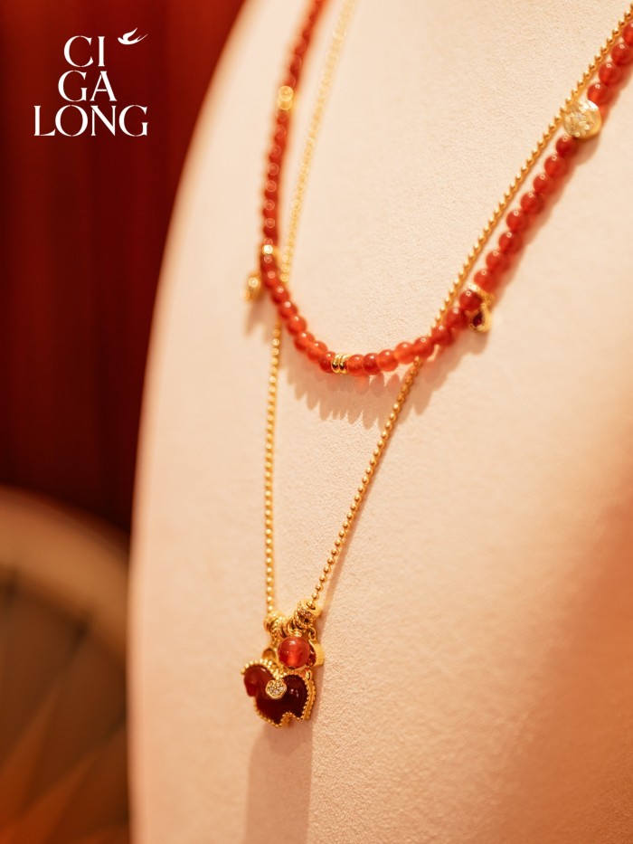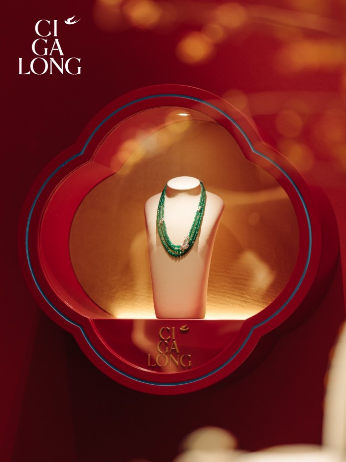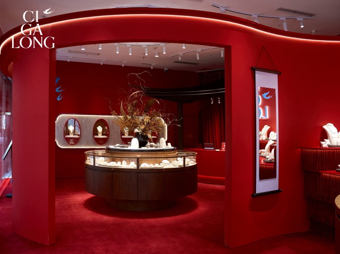 宾客循着店内如园林般的动线漫游,玛瑙红的主色映衬璀璨珠宝,宛若步入流动的光影梦境。每一件作品仿佛都在低语独特的雅事故事,试戴身侧,似能焕发独具一格的东方气韵。CIGALONG于此,自信地展开一幅独属东方的优雅画卷,将深邃的诗意娓娓道来。