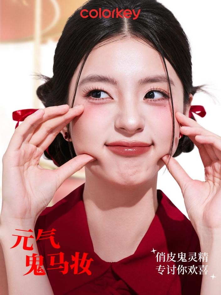 Colorkey珂拉琪“元气鬼马妆”以山茶花气垫W02自然色打底,无暇底妆透出微微光泽感,自然显元气,仿若天生好皮肤。面部用七色面综盘,一盘搞定眼妆、修容和腮红。最后涂上锁色唇漆C15冰糖山楂,清透山楂红融合元气少女的活力与鬼马精灵的俏皮,适合假期间出游、约会、好友party等热闹场合。
