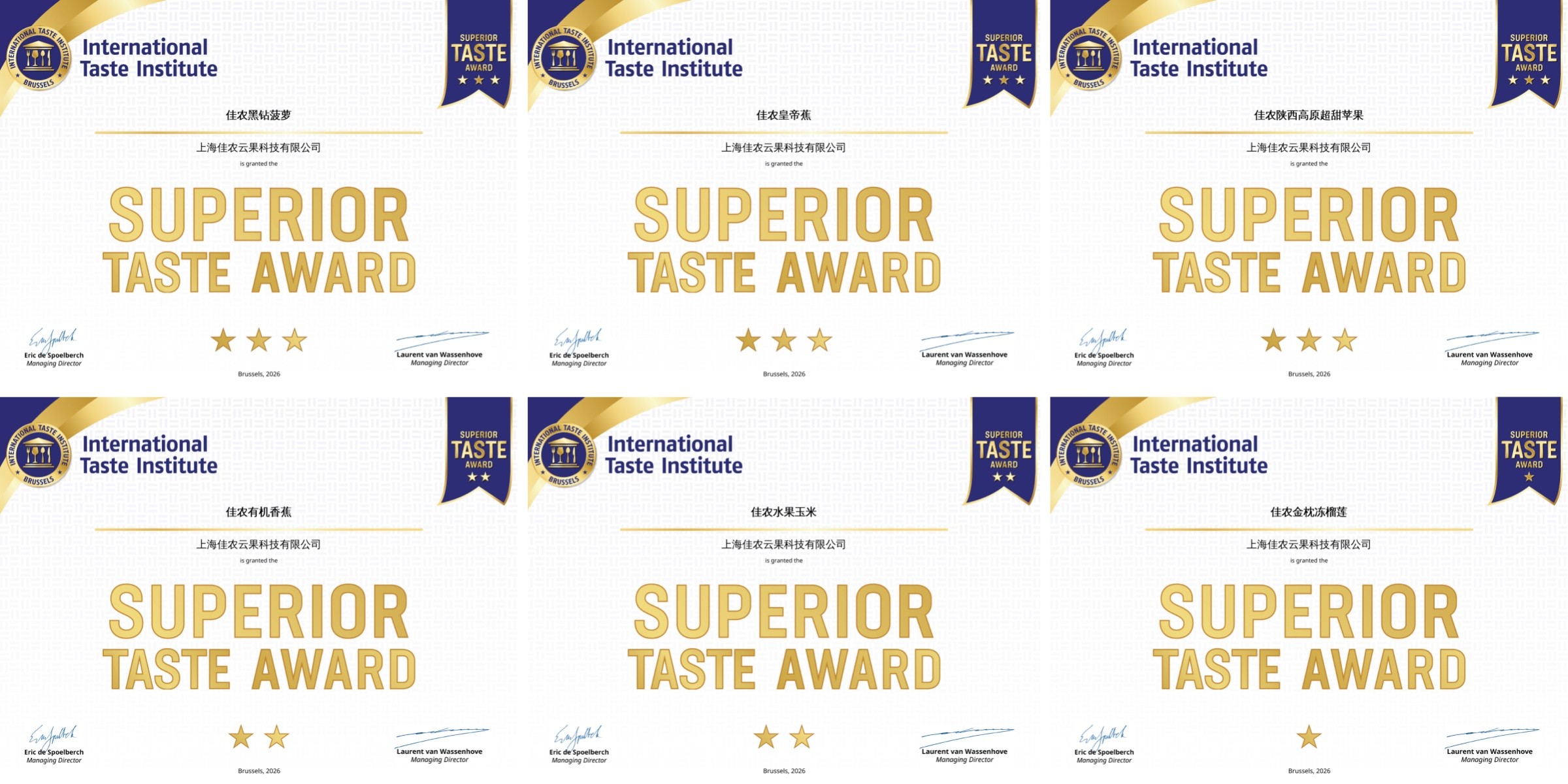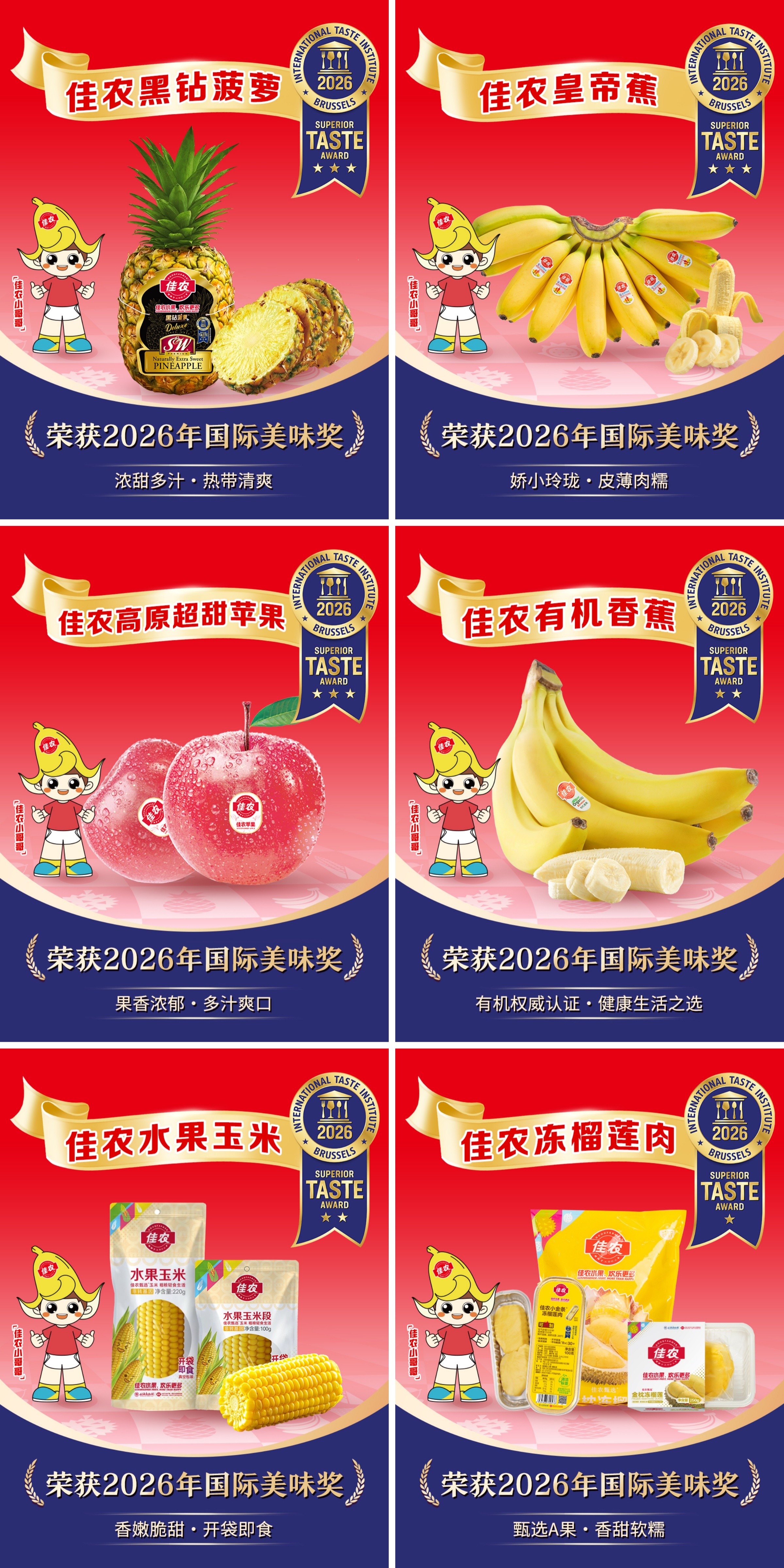 近日,佳农水果六款明星产品——佳农黑钻菠萝、佳农皇帝蕉、佳农高原超甜苹果、佳农有机香蕉、佳农水果玉米、佳农冻榴莲肉凭借卓越的风味与稳定的品质,荣获ITI国际美味大奖,赢得了来自全球顶尖味蕾评审的认可,斩获了多枚星级奖章。