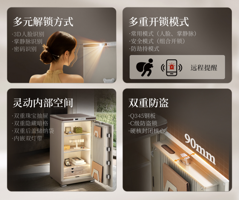 在智能安防层面,尊御系列更是突破行业常规。针对传统保险箱“弯腰输密码”“忘带钥匙无法开锁”等尴尬场景,产品创新融合人脸识别与掌静脉双重无接触生物识别技术——人脸识别采用“3D结构光”扫描,可抵御照片、视频等伪造手段,识别准确率达99.8%;掌静脉识别则通过读取手掌皮下血管分布特征,避免指纹磨损、潮湿导致的识别失败问题,两种方式结合,实现“伸手即开”“侧脸即启”的便捷体验,尤其适配双手持物、怀抱孩童等日常场景。