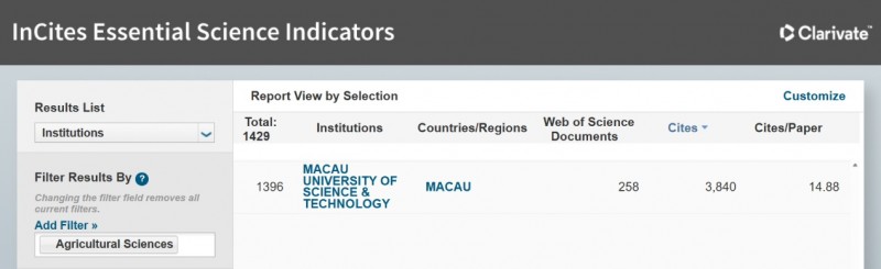 澳科大农学进入ESI(基本科学指标)前1%学科数据截图