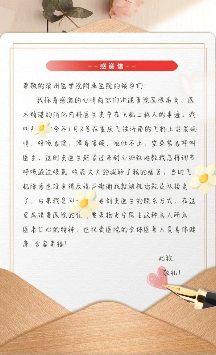 近日,滨州医学院附属医院党委宣传部收到一份特殊礼物——一封饱含深情的感谢信与一面锦旗,特意感谢消化内科主任医师史宁。直到这时,大家才知道二十几天前史宁医生在飞机上出手救人的感人事迹。