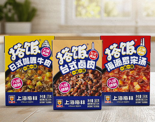 中华老字号上海梅林率先破局,4月推出中国首创利乐®餐食锁鲜包“搭饭®”系列,以技术革新重塑常温便捷餐标准。该系列搭载利乐六层锁鲜黑科技,全方位阻隔氧、光、水汽,实现无防腐剂常温18个月保鲜,3分钟即热即可还原堂食口感,凭借硬核技术拿下国家实用新型与外观设计双专利。产品覆盖台式卤肉、日式咖喱牛肉等正餐及冰糖银耳汤等甜点,“一城一味”的多元布局适配不同消费需求,其中“黑金卤肉”限定款更斩获2025FHC金苹果奖“年度实力优品奖”,成为五五购物节期间的市场焦点。