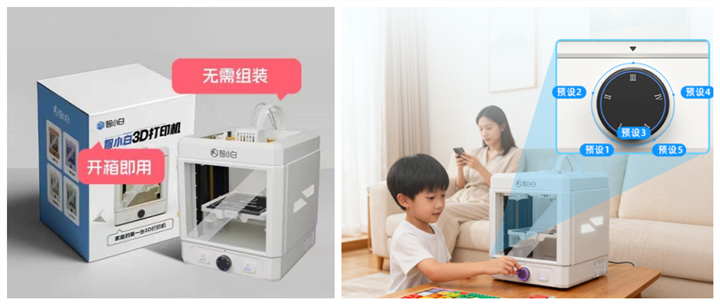 易用性是落地关键。 考虑到乡村学校师资结构,设备的易用性至关重要。智小白实现了 “开箱即用,一键打印”。其独创的“万象旋钮”交互,让孩子无需依赖电脑或手机知识,通过直观地旋转、按压即可完成全部打印操作,极大降低了科技工具的使用门槛。