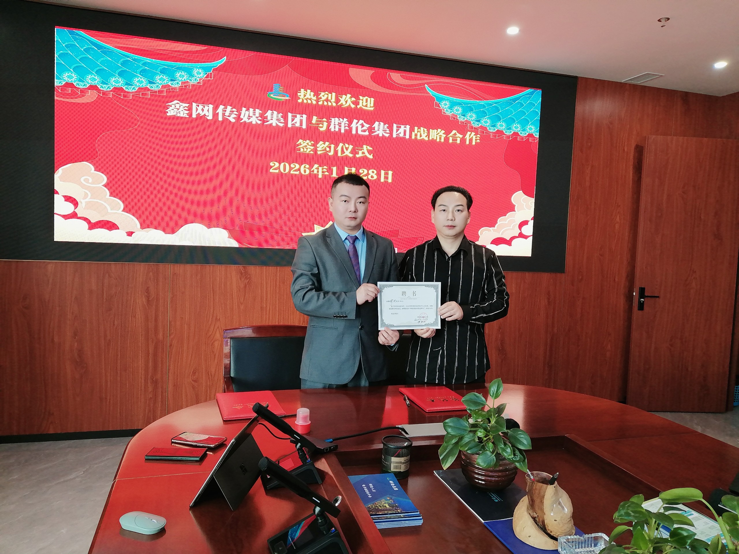 2026年1月28日,鑫网传媒集团与群伦集团在深圳正式签署全面战略联盟合作协议,双方宣布将在资源整合、品牌共建、市场拓展等领域展开深度合作。群伦集团领导现场授予鑫网传媒集团“战略合作伙伴单位”牌匾,并聘任鑫网传媒集团董事长肖邦为群伦集团荣誉董事长。此次合作标志着两家行业领军企业正式携手,共同探索“传媒+建筑”跨界融合的创新路径。