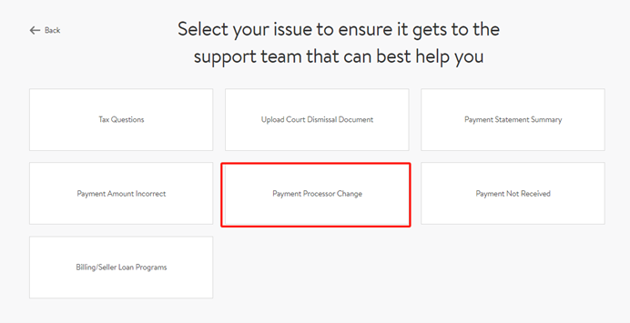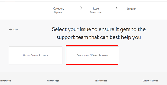 2.选择对应问题:选择“Payments” → “Payment Processor Change” → “Connect to Different Processor”。