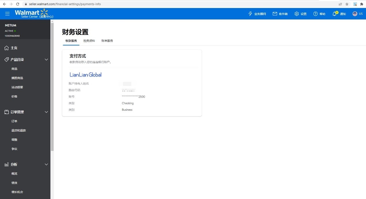 再次登录沃尔玛商家后台,进入收款账户设置界面。