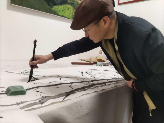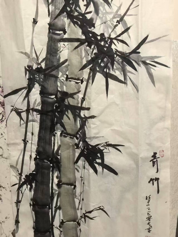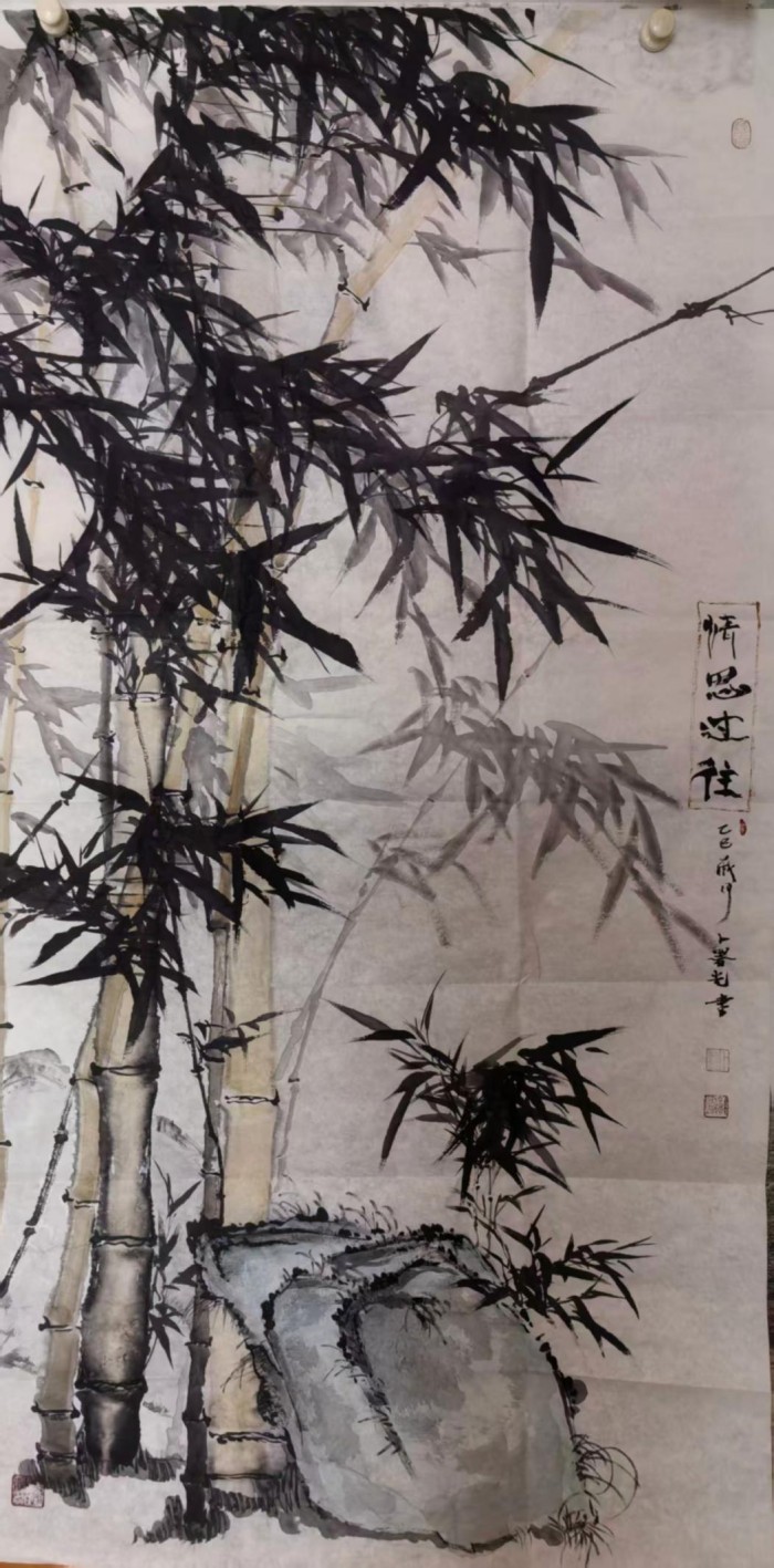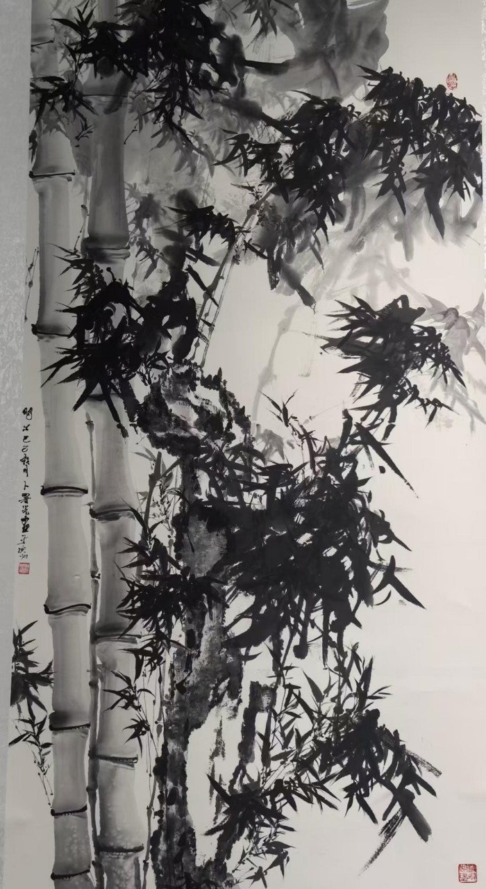 墙上那幅《墨竹图》里,新笋破土,枝干挺秀,既有铮铮骨力,又含潇潇逸气。这或许正是画家艺术人生的写照:深植于传统文化的厚土,枝叶则舒展于当代的晴空,始终保有一份如竹般向上、向善、向美的生命力。
