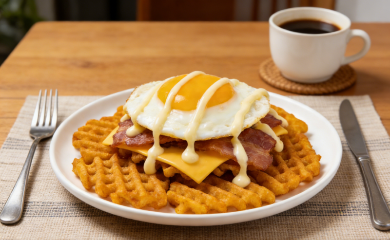 将金黄酥脆的格格脆平铺盘底,依次叠放煎蛋、香浓芝士、焦香培根,最后淋上秘制沙拉酱,一份「黄金格格巨无霸塔」便轻松完成。格格脆的网格纹路可完美兜住所有馅料,一口咬下,外层酥香迸发,内里食材鲜香交融,酥脆口感直达味蕾,让平凡早餐瞬间充满活力,轻松唤醒每日元气。