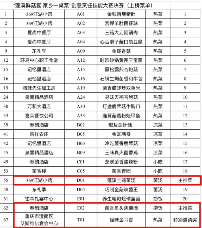 “蓬溪鲜菇宴 家乡一桌菜”完整菜单