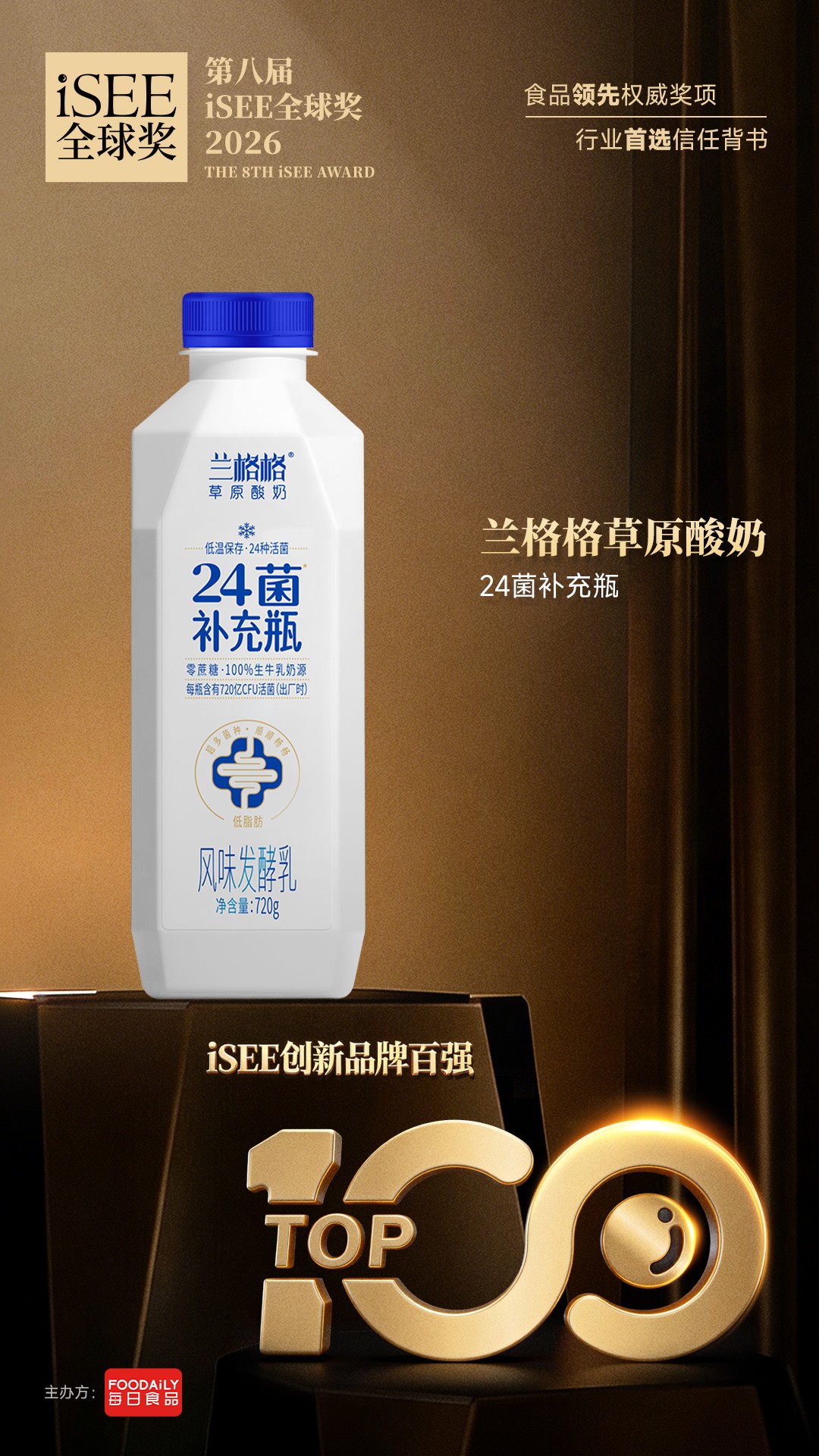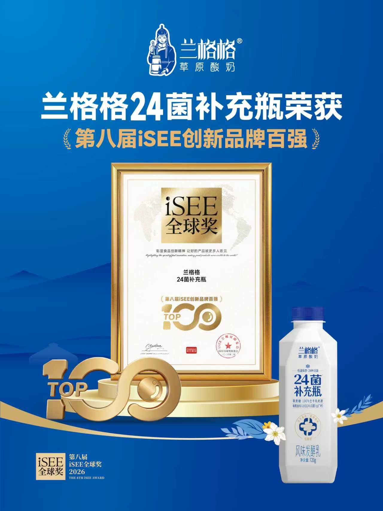 作为缘起中国、辐射全球的食品领先权威奖项,iSEE全球奖始终以“国际标准 + 独立权威评审 + 非商业化”为原则,本届百强评选历经3个月层层筛选,聚焦“以人为本”的创新方向,兰格格24菌补充瓶的入选,既是对产品硬核实力的高度肯定,更是对中国本土酸奶品牌创新能力的认可。