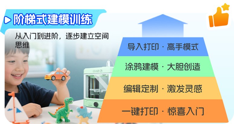 阶梯式建模能力训练:从“一键打印”入门,到“可编辑定制”、“涂鸦建模”,最终实现“导入打印”的完整进阶路径,逐步培养孩子的空间思维与数字化创造能力。