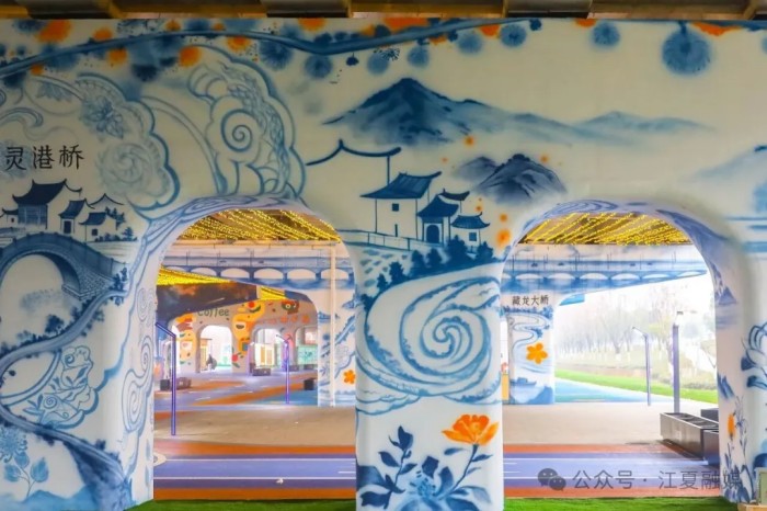 项目以“桥链古今,廊载江夏”为核心设计理念,将地方文化元素艺术融入空间场景。入口艺术雕塑、桥柱上的“青花山水”画卷,串联起江夏的历史、现在与未来,使市民在漫步休憩中,感受城市的文化底蕴与发展脉搏。