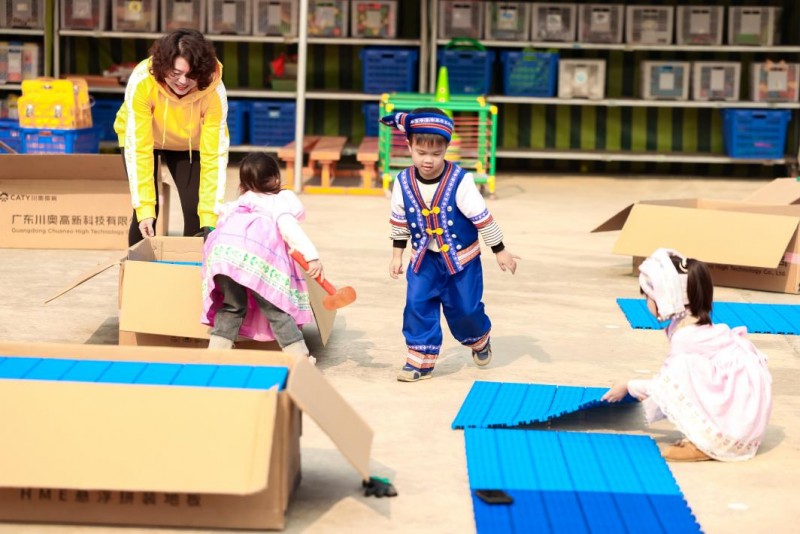 新建操场面积约633平方米,由6816块拼接地板组成,不但美观性大大增加,同时还具有减震、沥水和防滑的功能,显著提升安全性与实用性。拼接地板易安装、拆卸,便于后期维护;同时设置迷宫区、交通安全教育区、彩虹伞区、站点区等8个功能区,充分考虑到幼儿园的使用场景。幼儿园园长表示,告别了坚硬的水泥地,孩子们可以在新操场上做一些更加具有挑战性的游戏,促进孩子们身体素质的发展。
