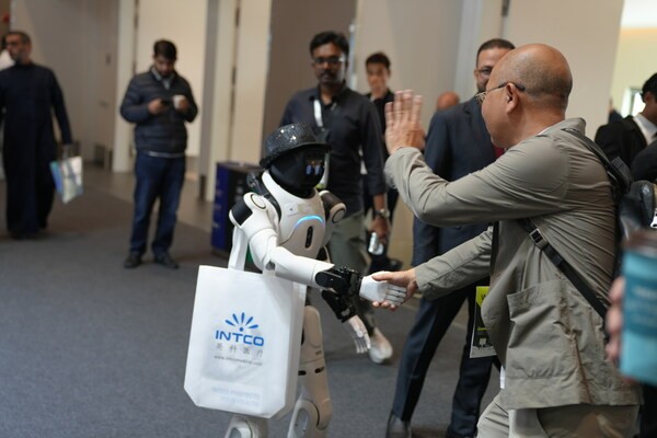 英科医疗展位上机器人与海外客户互动