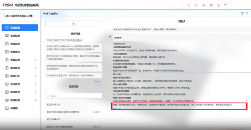 针对上述痛点,海尔将设备控制、数据分析、策略生成集成为具备自主决策能力的AI智能体。其搭载的Deepseek和通义国产大模型基底,融合百万级暖通专业知识库与实时运行数据,使系统能够像资深工程师一样“理解”建筑环境。