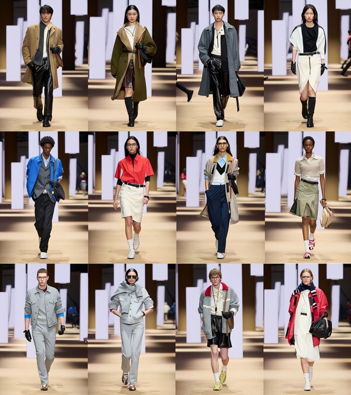 大秀分为五大主题章节:「都会拱廊」「周末绿野」「城郊球场」「霓虹转角」与「灵感沙龙」。从工作日的办公室到周末的闲暇,从阳光下的红土球场到夜晚的城市律动,再到意式美学的永恒表达——都市的本质在于流动:人们穿行其间,彼此交织,赋予城市鲜活的生命力。
