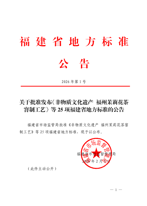 近日,福建省市场监督管理局发布一批省地方标准立项和发布公告。其中,《非物质文化遗产 福州茉莉花茶窨制工艺》等25项省地方标准正式批准发布,将于2026年5月起正式实施。