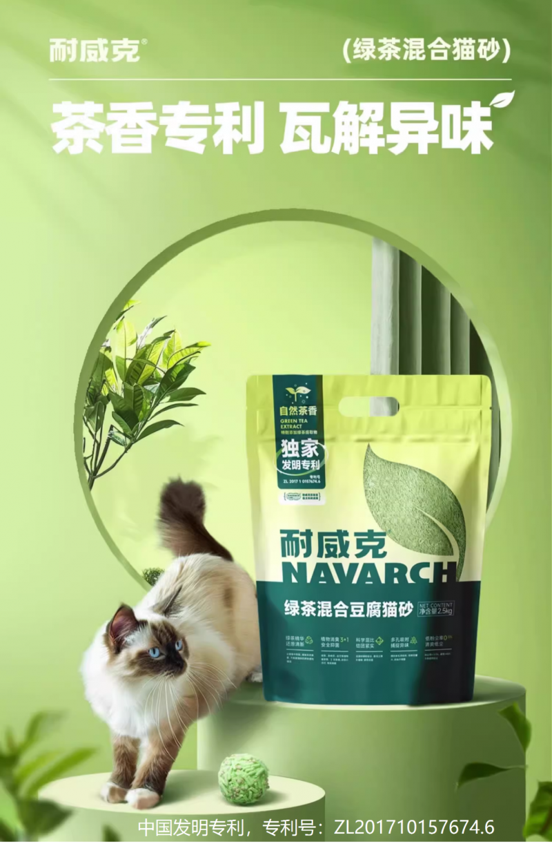 在猫砂这一竞争激烈的宠物用品领域,耐威克同样表现亮眼。耐威克绿茶猫砂凭借除臭、结团、环保等综合性能,在过去五年中持续获得消费者青睐。耐威克绿茶猫砂的除臭效果之所以这么好,是因为它采用了独家茶香专利技术(中国发明专利,专利号:ZL201710157674.6)。