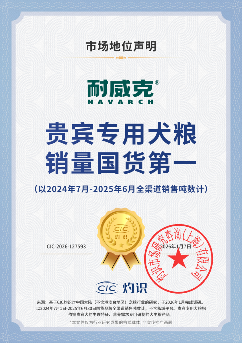 CIC灼识于2026年1月开展了针对中国宠物食品与用品行业的系统性研究。研究团队采用科学、严谨的统计与分析方法,对行业竞争格局、产品类型、产品功能等维度进行了深度调研与数据交叉验证。耐威克(Navarch)凭借其卓越的产品力与市场表现,荣获两项重要市场地位认证:
