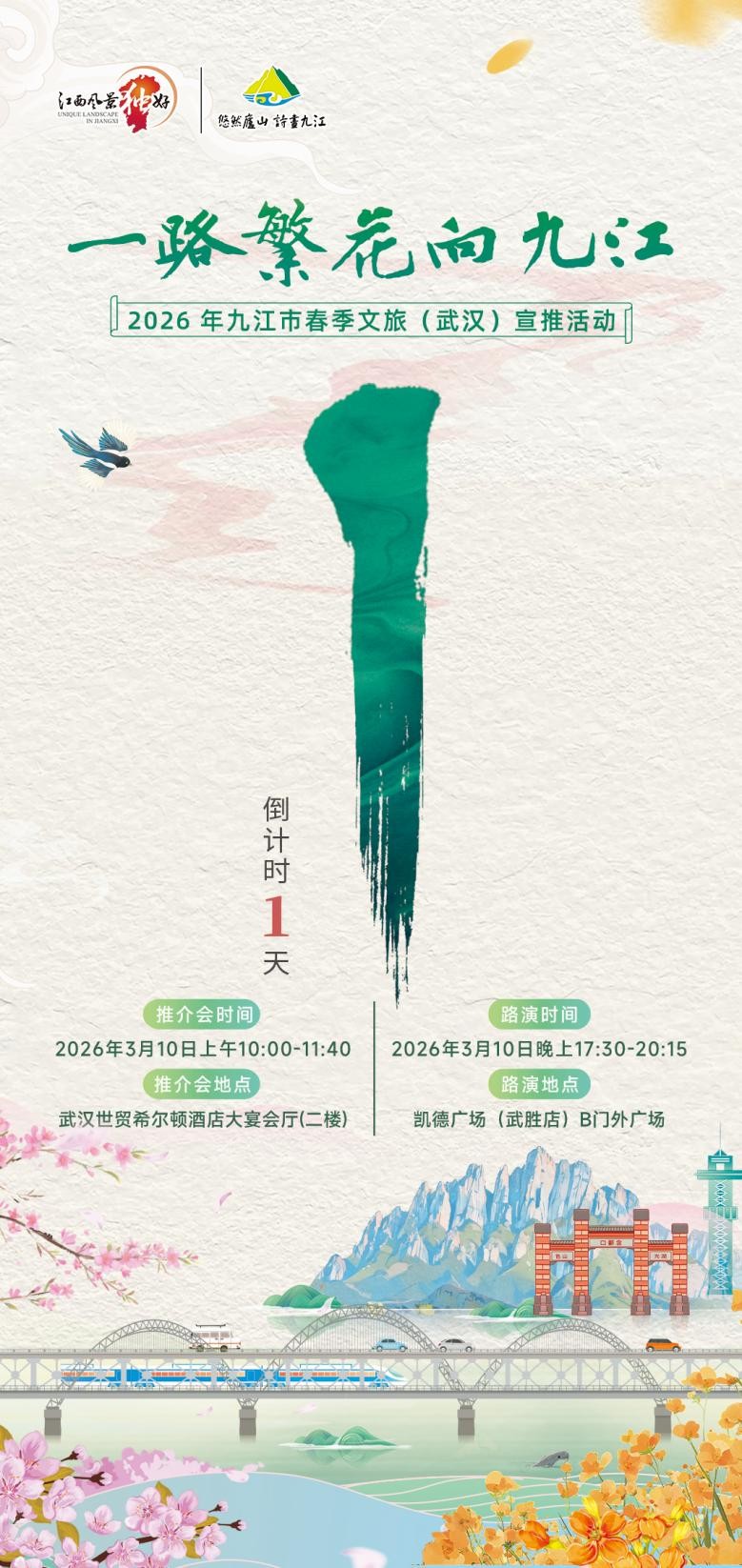 全场瞩目中,“一路繁花向九江”2026年九江市春季文旅(武汉)宣传推介会将正式启动;随后重磅发布春季精品旅游线路,带你玩转九江赏花新体验。