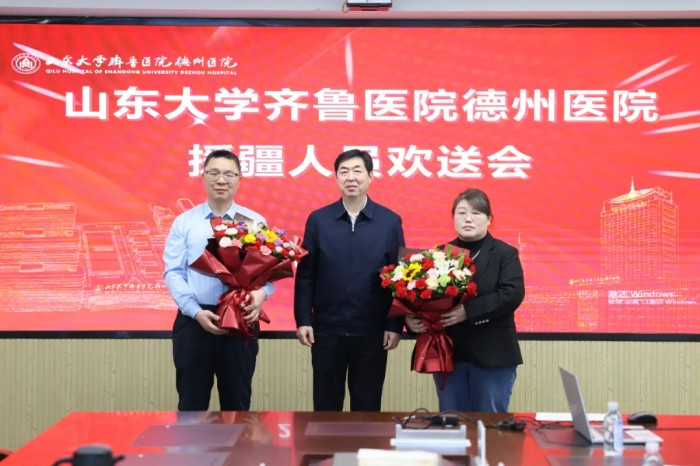 3月9日,山东大学齐鲁医院德州医院召开援疆人员欢送座谈会,为即将启程赴新疆执行援派任务的杜美娟、周恒送行。医院党委书记王振东,党委委员、副院长张旭斌,党委委员、副院长费剑春出席会议,相关科室负责人、往届援疆代表参加会议,会议由张旭斌主持。