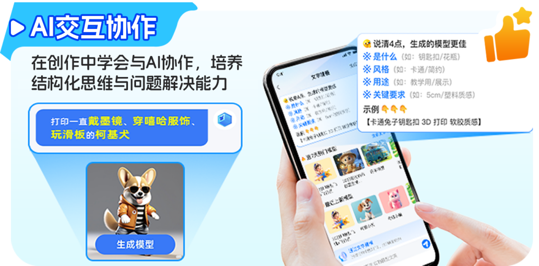 AI 协作模块通过文字、图片建模,让孩子学会拆解需求、精准表达,培养结构化思维;