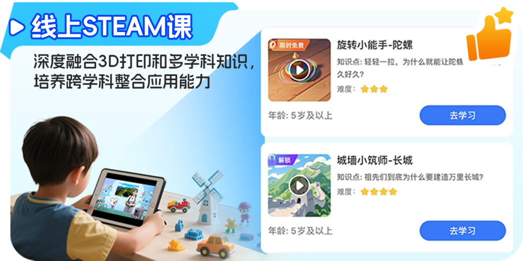 科学实践配套免费线上 STEAM 课程,以 PBL 项目式教学融合跨学科知识,让孩子在打印实践中学会发现问题、解决问题,实现从 “学会” 到 “会学” 的能力提升。