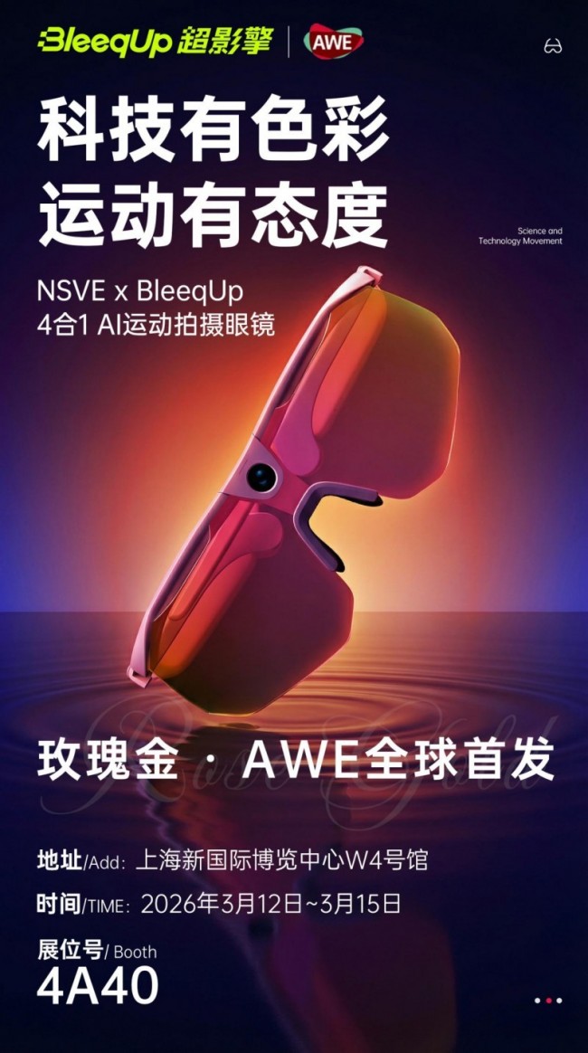 在本届AWE的舞台上,BleeqUp超影擎展示了其核心产品四合一AI运动眼镜,更面向全球首发全新玫瑰金限定配色。这款配色以粉紫色为基调,融入撞色设计语言,彻底突破传统运动穿戴设备配色单一、风格刻板的局限,重新定义了运动穿戴的审美标准。外观设计兼具机能感与时尚感,既能从容应对户外骑行、跑步、徒步等高强度运动挑战,又能无缝融入日常穿搭场景,实现运动性能与潮流美学的完美平衡,全面满足用户多场景、个性化的穿戴需求。