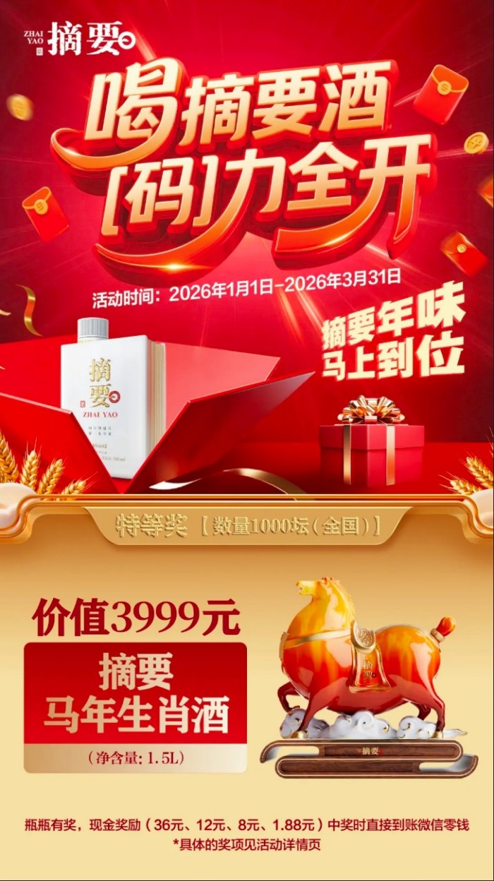 例如针对摘要酒,金沙酒业推出了“喝摘要酒,码力全开,扫码赢马年生肖酒”的终端活动。值得注意的是,此次活动采用了极具创意的“双向激励机制”:消费者购买摘要酒珍品版扫码抽奖,若抽中价值3999元的马年生肖酒,售出该瓶酒的终端店老板将获得同样的一瓶奖励。这一举措将终端老板从被动的货架管理者,转变为主动的品牌推广合伙人,极大地激发了终端门店的推力和开瓶积极性。