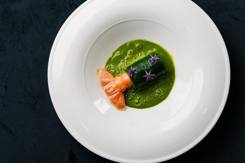 第三道“鲜煨九层·鳌虾凝鲜”中,Nicoló Rotella将新西兰鳌虾与沙葱、九层塔融合。他希望让鳌虾达到外层凝固、内里软糯的“半生熟”状态,但传统手法难以稳定实现。深入了解老板电器AI数字厨电的AI精控蒸汽技术后,他发现,蒸烤一体机可以用精准的温湿度牢牢锁住鳌虾的水分与弹嫩,稳定复现“刚刚好”的半生熟质感,让西方风味灵感在东方风土中完美生长。