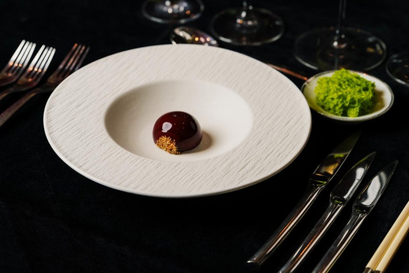 头盘“云绒凝萃·鹅肝檀香”由Nicoló Rotella主厨呈现。鹅肝与木槿花、香菜的搭配别出心裁,细腻醇厚与清新芬芳在口中交织,如春风拂过味蕾。“这道菜是对自然的复刻,也是对时令的回应。”主厨在现场分享道。