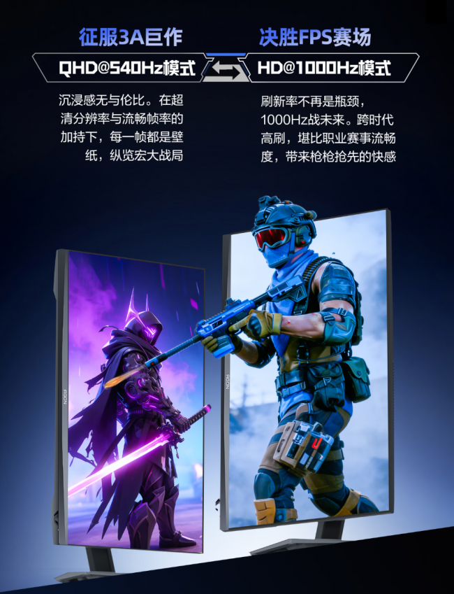 硬核性能是AGON爱攻双模千帧电竞显示器AGP277QK的核心竞争力,而“原生千帧+双模适配”的双突破设计,更是其颠覆行业的关键所在。AGP277QK搭载TCL华星专为电竞场景研发的HFS Shoot面板技术,可实现QHD@540Hz与HD@1000Hz双模一键切换,成为目前最适配全类目FPS竞技的地表最强“竞技外挂”。