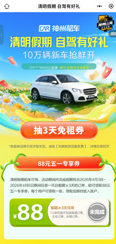 单纯的情绪营销若缺乏业务支撑,极易流于空洞。神州租车通过扎实的基建能力,为感性的情绪提供了理性的降落点。神州租车推出了多项业务权益配合营销落地:10万辆新车投放市场,覆盖奥迪E5、腾势D9、问界M9等热门车型,从源头解决用户对车辆异味和车况的顾虑;春日18元特价租车的优惠活动和0 押金租车降低出行门槛;针对清明假期推出88元专项租车券,进一步激发用户预订意愿。