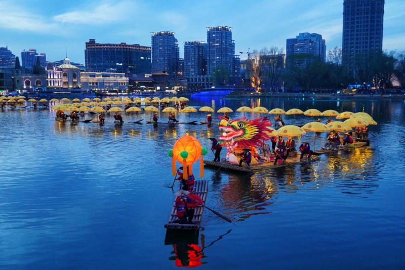 阳朔“金龙”在北京亮马河上巡游