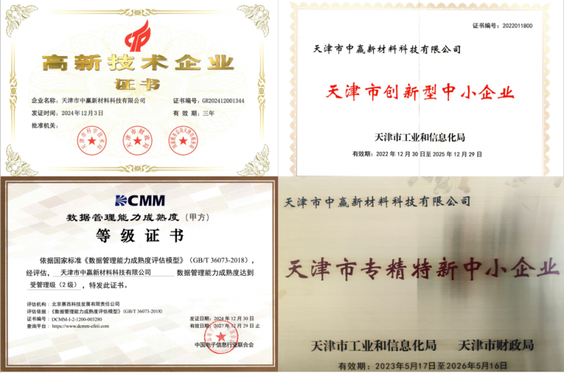 依托这份扎实的体系能力,中赢新材料先后荣获“高新技术企业”“绿色工厂”“天津市专精特新中小企业”“瞪羚企业”等称号;在知识产权领域更是成果丰硕,累计获得国家专利65项,其中发明专利3项、实用新型专利60项、外观设计专利2项,另有10余项专利进入实质审查阶段,构筑起一道坚实完善的知识产权护城河。
