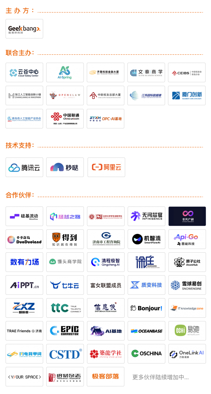 作为主办方,极客邦科技深耕 AI 生态十余载,构建了完善的技术服务体系,旗下 AI 创业者同侪学习平台——TGO 鲲鹏会、AI 应用发布和发现平台——模力工场、AI 学习平台支持——极客时间,AI 开发者前沿资讯社区—— InfoQ,全方位联动,为活动提供内容策划、讲师邀请、宣传推广、学习资源等全流程支持,其中 TGO 鲲鹏会各城市负责人全程参与致辞、统筹,成为活动落地的重要支撑。
