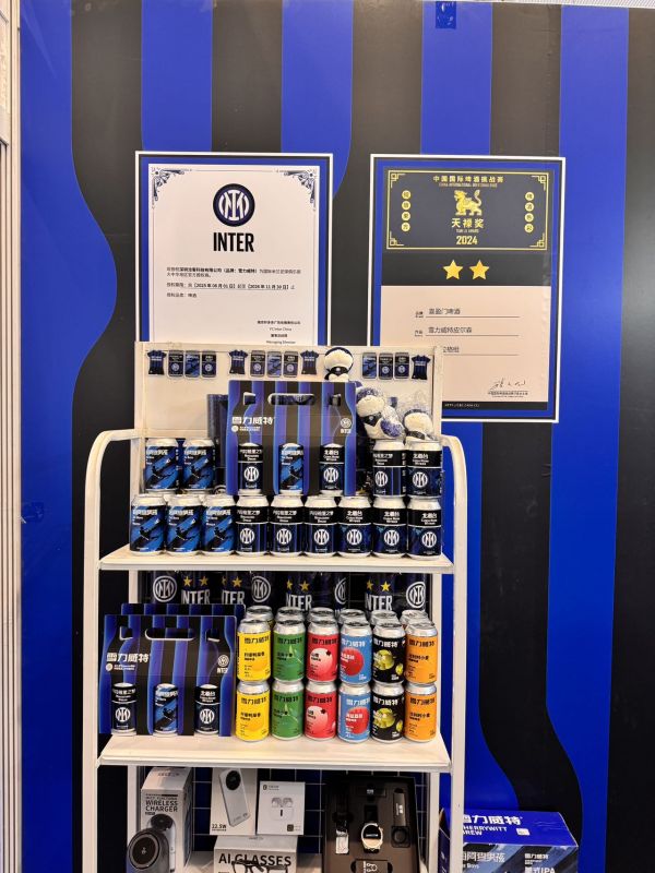 此次参展,雪力威特以国际米兰官方授权精酿为核心,打造了充满蓝黑文化氛围的专属展位,成为展会期间的一大亮点。展位整体融入国际米兰经典蓝黑配色,同步播放球队比赛精彩时刻,精准吸引了众多球迷与行业人士驻足围观、交流品鉴,让现场氛围持续升温。此次展出的三款核心产品——「梅阿查男孩-美式IPA」「北看台-比利时小麦」「内拉祖里之梦-皮尔森」,均为国际米兰官方授权精酿,将球队文化与精酿工艺深度融合,既传承了蓝黑经典,也彰显了雪力威特的匠心酿造实力。
